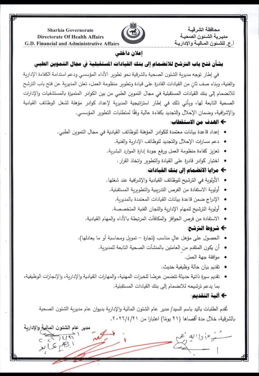 تعلن الإدارة العامة للشئون المالية والإدارية بمديرية الشئون الصحية بالشرقية عن حاجتها إلى كوادر جديدة من العاملين بالصحة للإنضمام إلى بنك القيادات المستقبلية في مجال التموين الطبي، وذلك وفقأ للاشتراطات المذكورة بالإعلان.